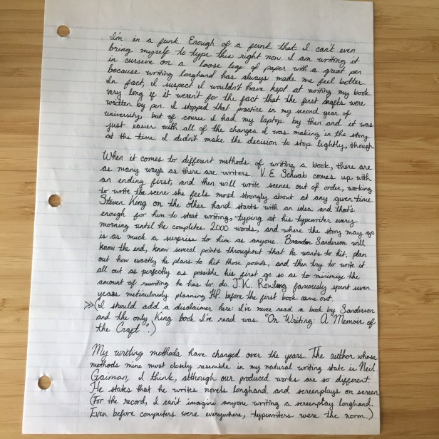 I stopped that practice in my second year of university, but of course I had my laptop by then and it was just easier with all of the changes I was making in the story at the time. I didn’t make the decision to stop lightly, though.