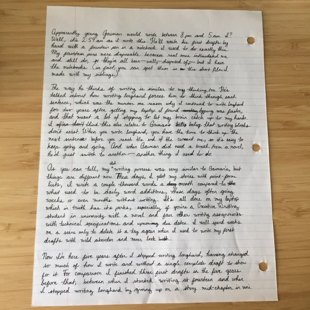 So my old writing process was very similar to Gaiman’s, but things are different now. These days, I plot my stories with point-form lists, I write a couple thousand words a month compared to what used to be daily word additions, and often go weeks or even months without writing. It’s all done on my laptop, which in truth has its perks, especially if you’re a Creative Writing student in university with a novel and four other writing assignments with technical specifications and upcoming due dates. I will spend weeks on a scene only to delete it and try again, while I used to write my first drafts with wild abandon and never looked back.